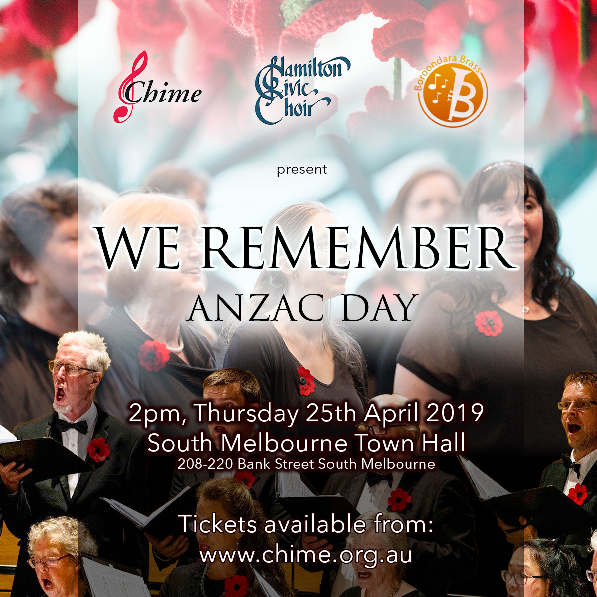 During DCINY rehearsals, Musical Director Timothy Carpenter connected with the Musical Director of CHIME who subsequently invited Hamilton Civic Choir to perform with them for their ANZAC concert this year. Each choir will perform some pieces of their own and then combine. Hamilton Civic Choir will also give a concert at St Andrew’s Church in Brighton. The programme will consist of New Zealand and Australian works including David Hamilton’s In Flanders Fields, Three Australian Bush Songs by Iain Grandage and a new composition by Hamilton Civic Choir bass, Joshua Dawson.