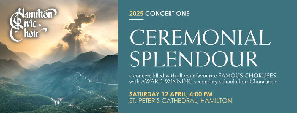 Do come and hear the Hamilton Civic Choir and special guest choir Choralation (as seen in the new movie “TINĀ”) for an unforgettable afternoon of grand choral music in our opening concert of 2025, Ceremonial Splendour.